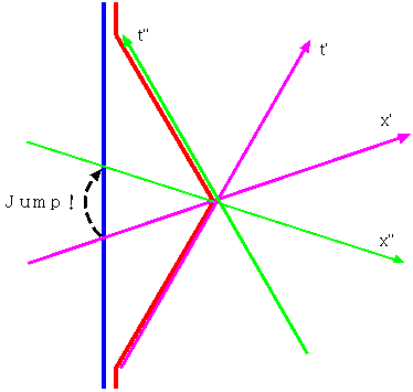 結局、x′−t′系での同時がx−t座標系から見ると傾いていてx−t座標系での同時と同じではないため、このように「互いに相手の時間を短く感じる」という一見矛盾した結果が出る。