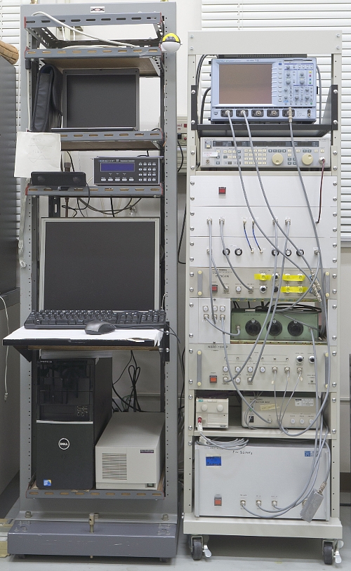 NMR/NQRスペクトロメータ1ダブルへテロダイン方式のスペクトロメータです。周波数範囲1~400MHzでNMR/NQR測定が可能です(パワーアンプはそこまで広帯域ではないので交換が必要ですが)。本機種は市販されている装置や業者に作成してもらった装置の組み合わせにより構成されています。比較的一般的な装置だと思います。 |